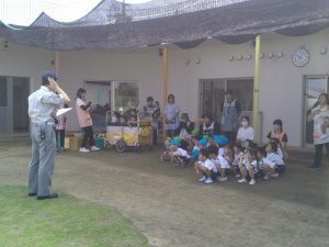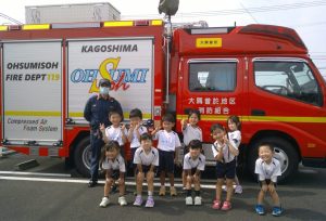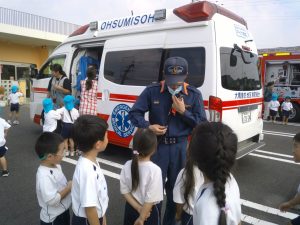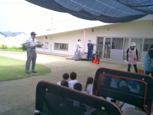 消防署の方に、「お・か・し・も・ち」についても話をしていただきました。「お」押さない、「か」かけない、「し」しゃべらない、「も」もどらない、「ち」近寄らないが火事の時の約束だそうです。子どもたちは、しっかり話を聞いてくれていました。