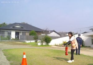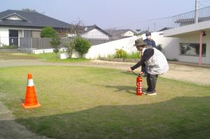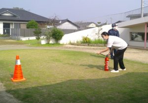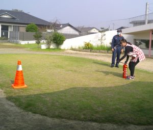 16日に消防署立ち合いの、避難訓練を行いました。「給食室から火が出ました!」の連絡を受け、担任の話を聞いてみんな園庭に避難しました。しっかりと口を押えて、上手に避難できていました。