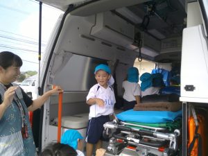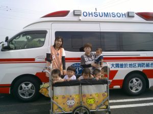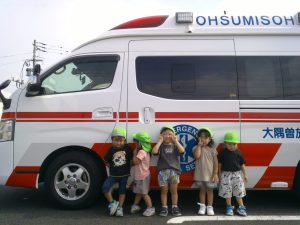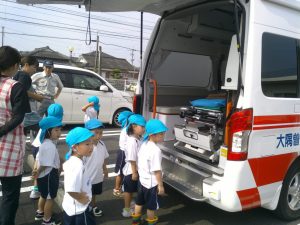 避難訓練は、非常ベルの音も怖がることもなく、みんな上手に避難できていました。大好きな、救急車や消防車を見学できて、うれしそうな子どもたちでした。