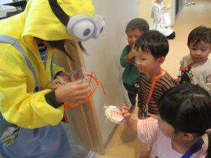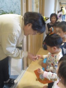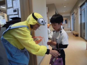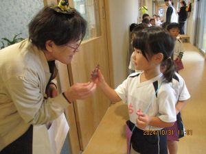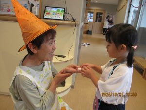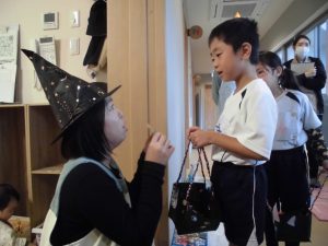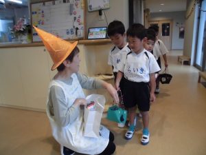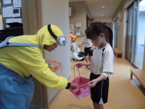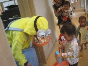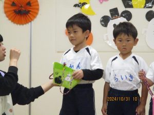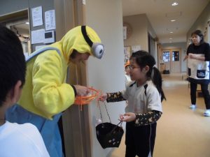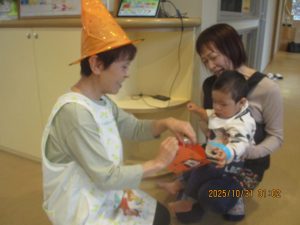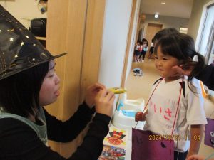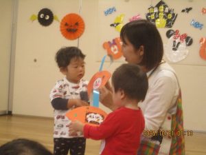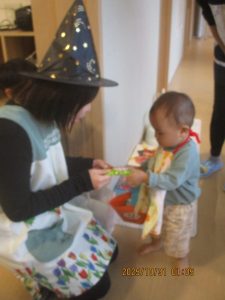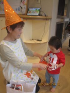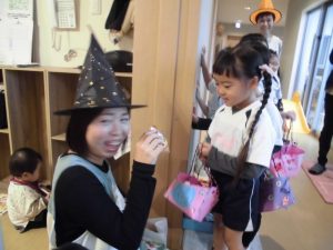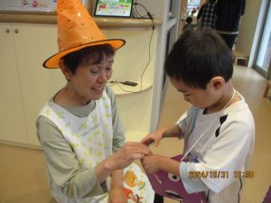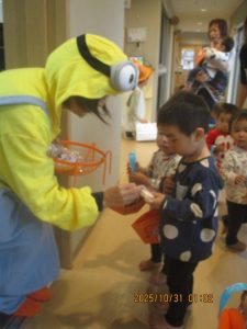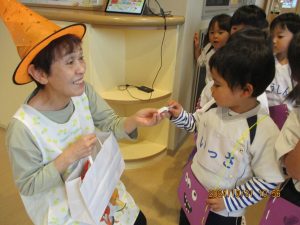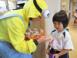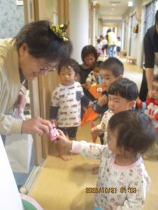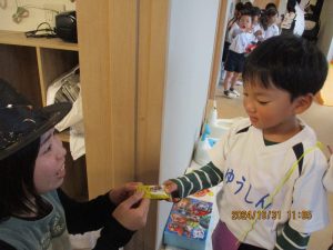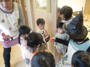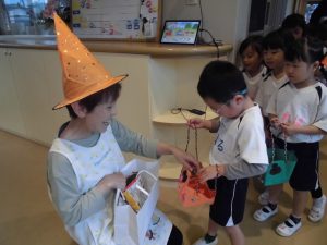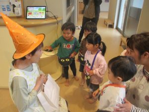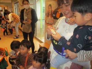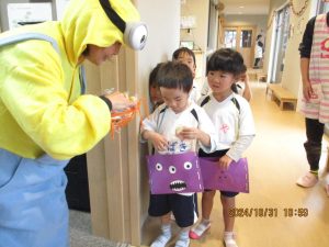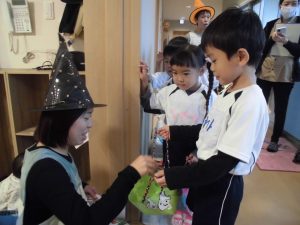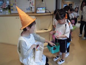 そら組のお友だちは、「トリックオアトリート!」と言ってお菓子をもらいました。