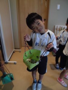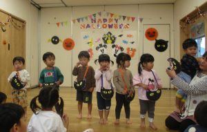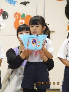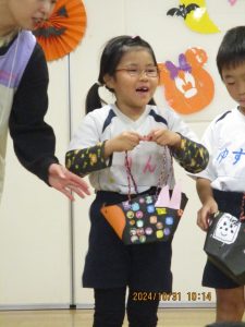 10月31日にハロウィン会をしました。まずは、各クラスで作った、お菓子を入れるバックを紹介しました。どのクラスも、ハロウインの雰囲気が出ていて素敵でした。
