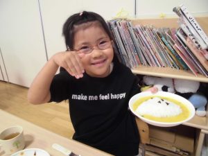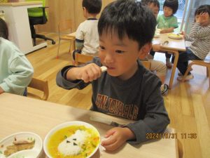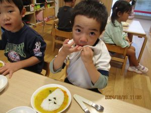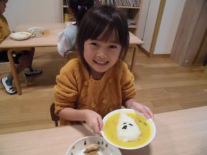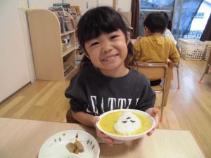 給食も、ハロウインメニューでした。かぼちゃのシチューライスがお化けになっていて、子どもたちはおいしそうに食べてくれていました。