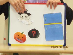 くいしんぼうのおばけのゲームをみんなで楽しみました。冷蔵庫の中身は何かな?