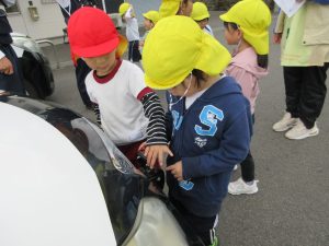 「まずは、パトカーの見学しますか?」という警察官の方のお言葉に、喜んでパトカーに駆け寄る子どもたち(^_^)