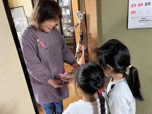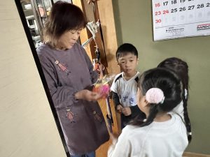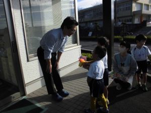 年長児のお友だちが、くりやさんに「お世話になりました。」「ありがとうございました」と手作りのお花とoお礼のプレートをお渡ししました。