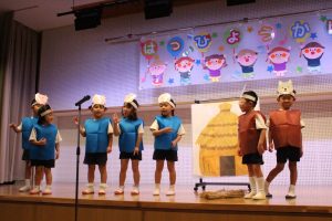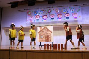以上児の劇「3匹のこぶた」です。わらの家、木の家、レンガの家を作ったこぶたとおおかみのかわいい劇をみんなで演じました。