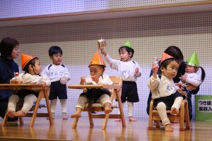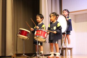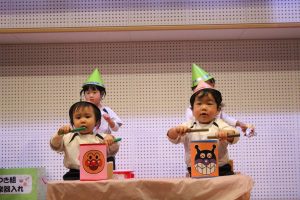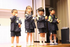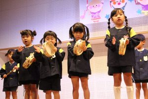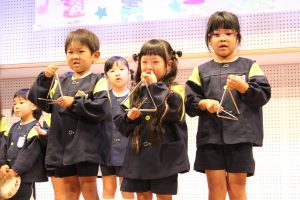 最後のプログラムは、以上児による合奏と合唱でした。合奏は、「山の音楽家」の曲に合わせていろいろな楽器に挑戦しました。楽器の持ち方や、音の鳴らし方、叩き方も様になっていました。