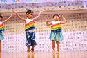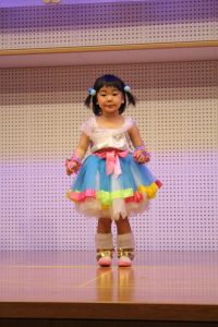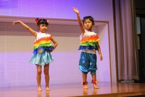 たいよう組の4歳児6名で「レインボー」を踊りました。にじのようにあでやかな衣装を身に着けて、元気に踊りました。