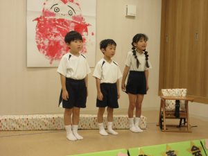 生活発表ということで、普段の朝の会の様子を再現し、大好きなだるまさんの絵本を読みました。