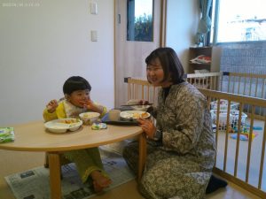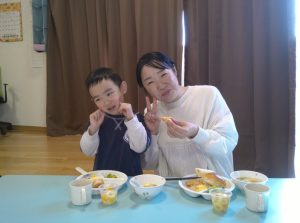 お誕生会の後は、楽しみにしていた給食です。大好きな、お父さんお母さんと一緒に給食を食べることができてとてもうれしそうでした。
