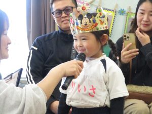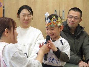 1月15日に、1月のお誕生会がありました。今月は、7名のお友だちがお誕生日を迎えました。6歳になった女の子は、好きな食べ物はイチゴだそうです。お家では、クリスマスにもらった鉄棒をしたり、なわとびをしたりと元気に遊んでいるそうです。