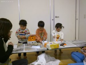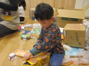 1歳児のお友だちは、廃材遊びも集中して遊んでいました。