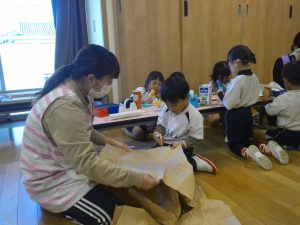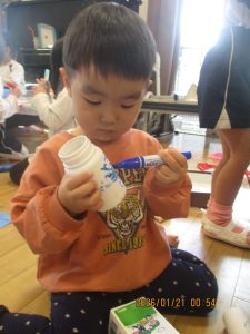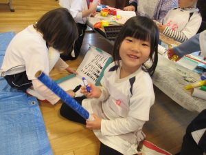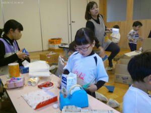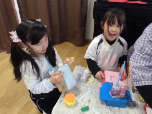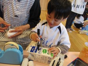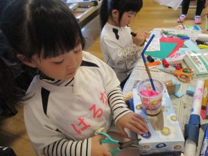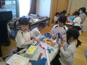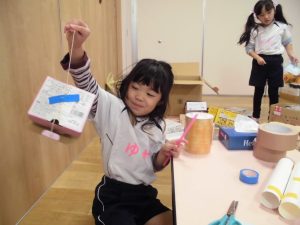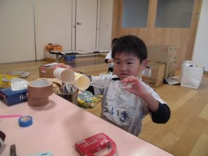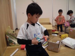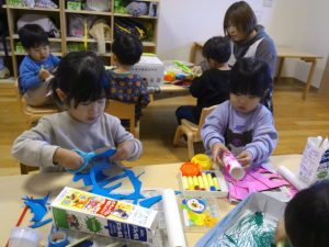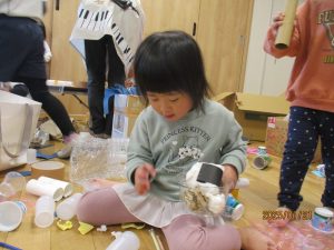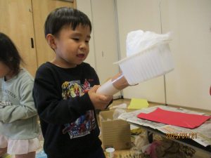 みんなそれぞれに工夫して、素敵な作品ができました。たくさん遊んでも、時間が足りないくらいでした。冬の廃材遊びは、子どもたちに大好評です。またクラスでも残った廃材で遊びたいと思います。