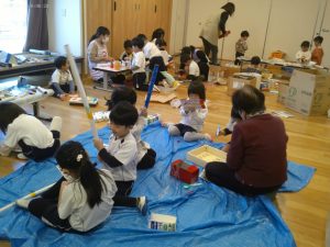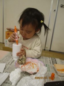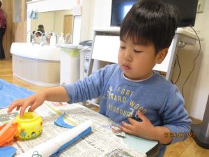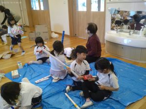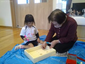 園長先生と一緒に大きな空き箱で色塗りをしたりして、楽しみました。
