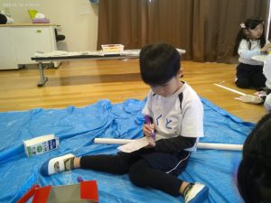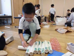 以上児のお友だちは、紙を小さく切ったり、ラップの芯をつなげようと工夫したりと、集中して作っていましたよ。