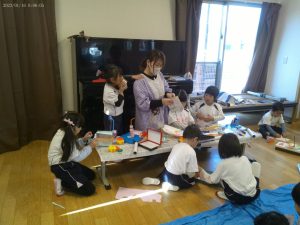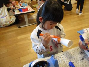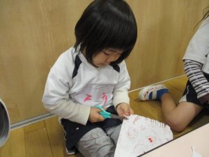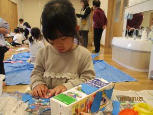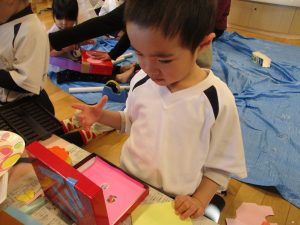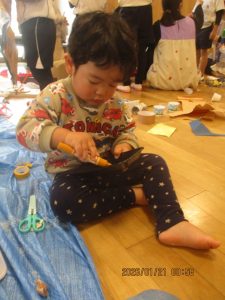 2歳児のお友だちも、ハサミを上手に使ったっりテープを使ったりして、楽しんでいました。