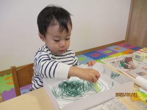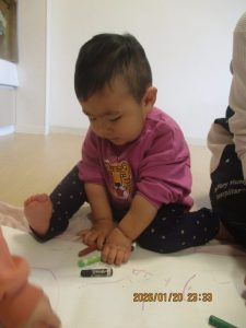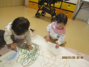 0,1歳児のお友だちは、大きな紙にお絵描きを楽しみました。