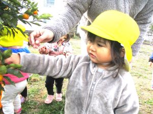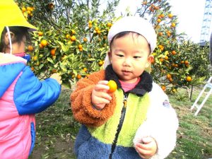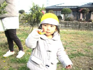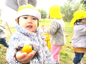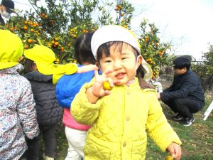 両手に握ったきんかんを見せています(*^-^*)