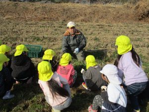 赤松さんから、じゃがいもの掘り方や種芋の話を聞き、賑やかだった子どもたちも