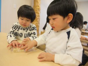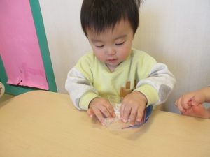 高野豆腐の感触は気持ちいいのかよく触っていました。
