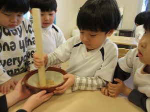 その後に、たいよう組さんは炒った大豆をつかってきな粉作りをしました。