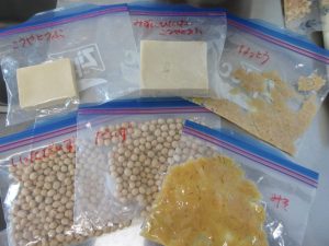 大豆・炒った大豆・高野豆腐・水に浸した高野豆腐・みそ・納豆を