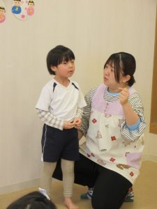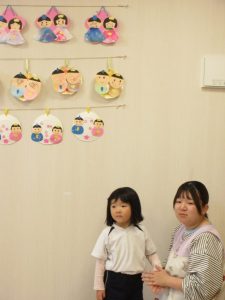 先生たちが顔を出すと、みんな「なになに~、おひなさまとおだいりさまだー」