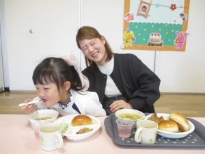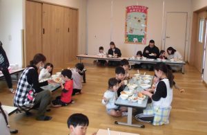 お誕生会の後は、楽しみにしていた給食です。そら組と、たいよう組はホールでみんなで食べました。