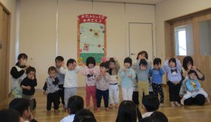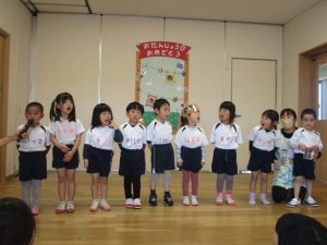 ほし組、つき組のお友だちが、「春が来た」の歌を歌ってお祝いしました。1歳のお友だちも上手に歌っていましたよ。