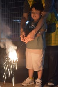 先生と一緒に手持ち花火を持って1人ずつ花火も体験。