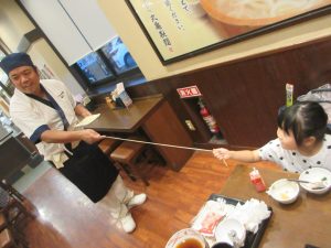優しい店長さんが子どもたちに生の麺を触らせてくださり、