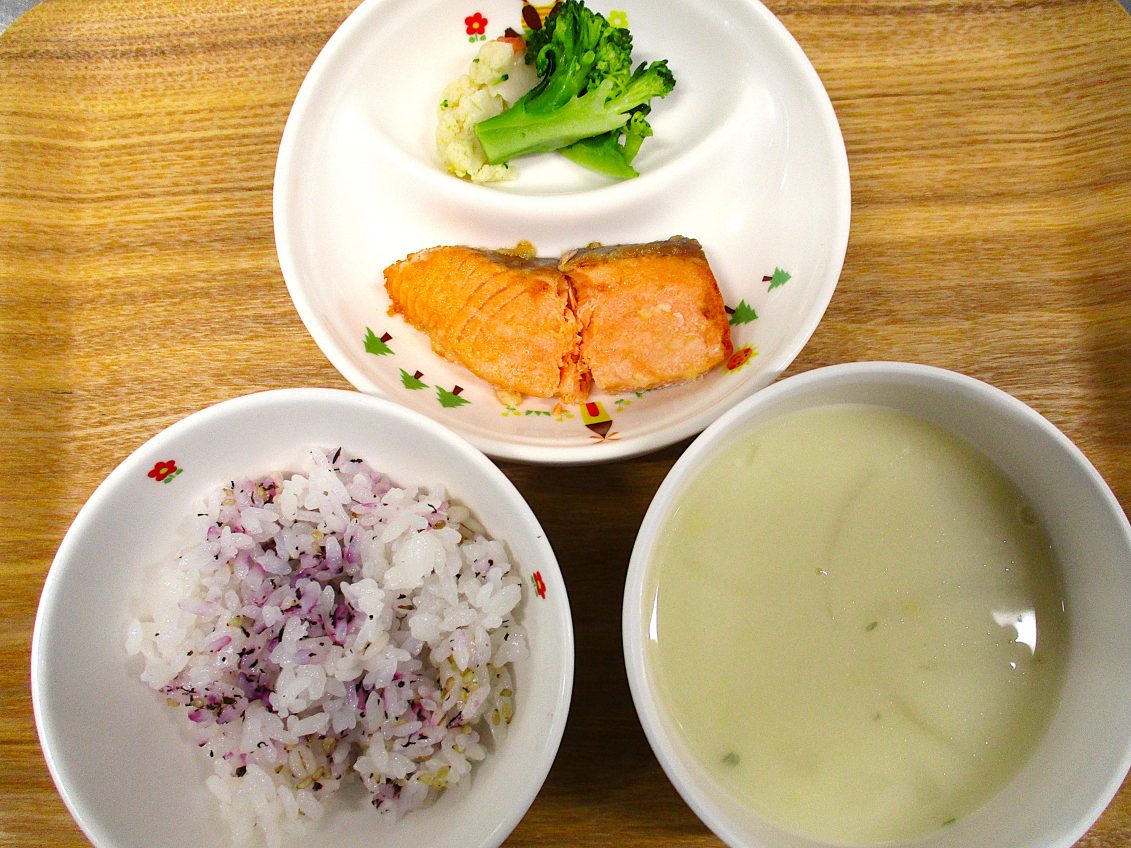 今日の給食は、ゆかりごはん、鮭のムニエル、コーンクリームスープ、そして**花野菜の和え物(ブロッコリー・カリフラワー)**でした。