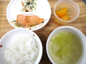 ・麦ごはん ・鮭の西京焼き ・白菜のすまし汁 ・法蓮草の白和え ・みかん缶