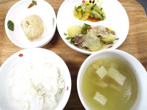 ・納豆ごはん ・肉じゃが ・五目みそ汁 ・春雨の酢の物