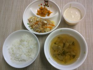 今日の給食は、厚揚げと豚肉のみそ煮でした✨はるさめも入っていて、食べ応えがあるメニューでした。優しい味付けで子どもたちもたくさん食べてくれました。にんじんのシンプルサラダはさっぱりと食べることができました。さといものすまし汁は、今が旬のさといもを使い、ほくほくしておいしかったです。きな粉ヨーグルトも甘くおいしかったです。子どもたちからピカピカしたお皿を見せてくれて、私もとっても嬉しかったです☺