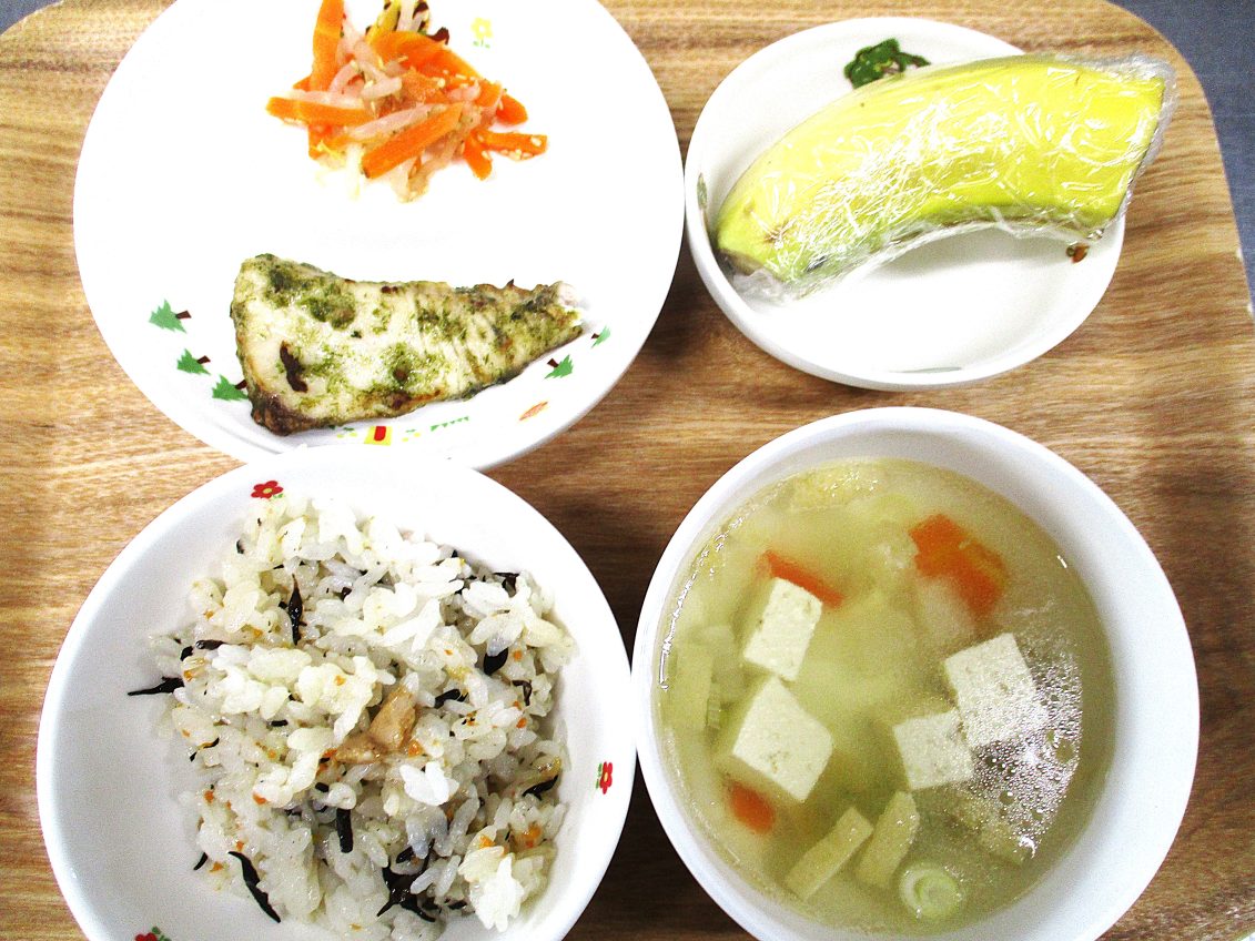・ひじきツナごはん ・白身魚の磯辺焼き ・けんちん汁 ・人参のごま和え ・バナナ