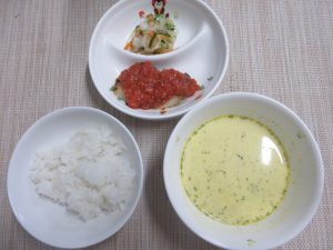 今日の給食は、さばのプロバンス風でした。にんにくが効いたトマトソースが脂ののったさばにかかっていてとてもおいしかったです。子どもたちも好きな味だったみたいで、おかわりもたくさんしてくれましたよ。切干し大根のサラダはさっぱりと食べることができました。かぼちゃのポタージュはかぼちゃとたまねぎの甘味があり、程よい味付けでおいしかったです。