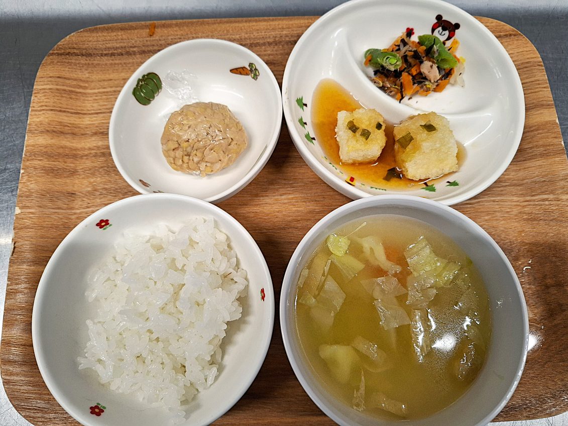 キャベツのみそ汁には、たっぷりの野菜と揚げが入っていて、体の中からあたたまるほっとする味でした。