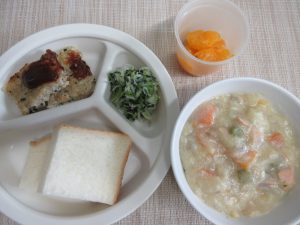サーモン入りの豆乳シチューは野菜が具沢山で食べ応えがありました。ミートローフは豆腐が入っていてふわふわでおいしかったです。子どもたちもよく食べていておかわりもしていましたよ♬小松菜のしらす和えもしらすの塩味があり、あっさりとしていて食べやすかったです。食パンはこども達に人気でした。あっという間に食べ終わっていて、パンのおかわりも人気でしたよ。