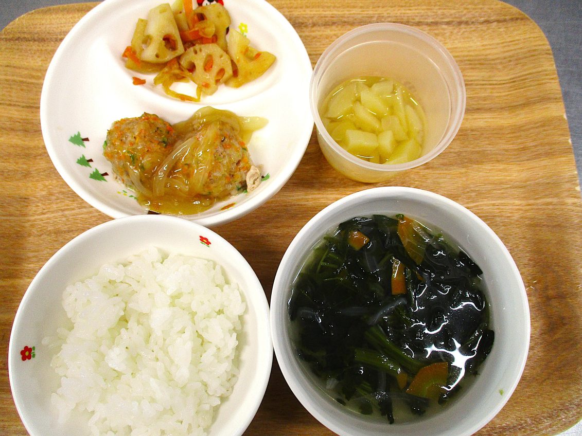 今日のメニューは「素ごはん」「肉団子の酢豚風」「ほうれん草のスープ」「レンコンのきんぴら」「もも缶」でした🥢🌸