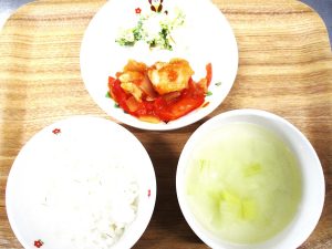 ・麦ごはん ・鶏のトマトソース煮 ・じゃが芋のスープ ・ミモザサラダ
