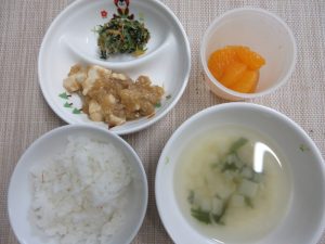 メインはマーボー豆腐でしたが、ねぎがたっぷり入っていて、程よい味付けでご飯がよく進みました。ほうれんそうのナムルもごま油の風味がして、とてもおいしく、だいこんのわかめスープはあっさりしていて飲みやすかったです。全体的によく食べてくれて、残食もほとんどありませんでした。みかん缶はどのクラスも人気で喜んで食べていましたよ☺