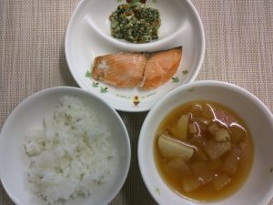 メインはさけの塩焼きで、程よく塩味があってごはんと相性抜群でした。白和えは、ごまがたっぷり入っていて、とてもおいしかったです。だいこんとあげの煮物風汁は、具沢山で食べ応えがあり、お腹いっぱいになりました。