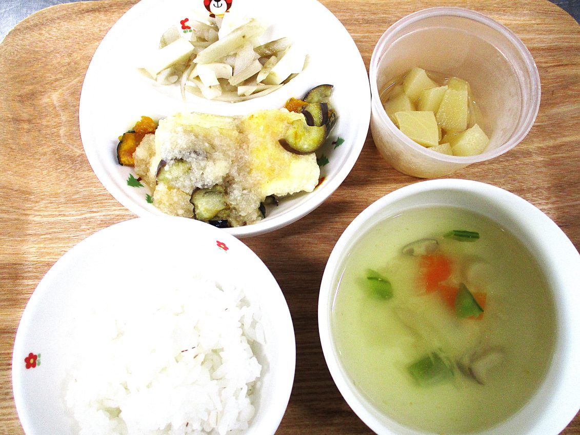 ・麦ごはん ・揚げ出し豆腐のみぞれ煮 ・きのこスープ ・れんこんマリネ ・もも缶