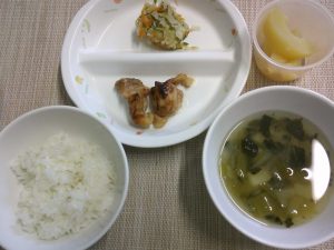 今日の給食は、鶏肉のマーマレード焼きでした。ほんのりマーマレードの風味がして美味しかったです。じゃがいものスープは、じゃがいもにコンソメの味が染みて、お野菜も一緒においしく食べることができました。切干大根のサラダはしらすの塩味もあり、さっぱりと食べることができました。今日のメニューはどのクラスも進みがよく、きれいに完食してくれました✨もも缶は喜んで食べていましたよ☺