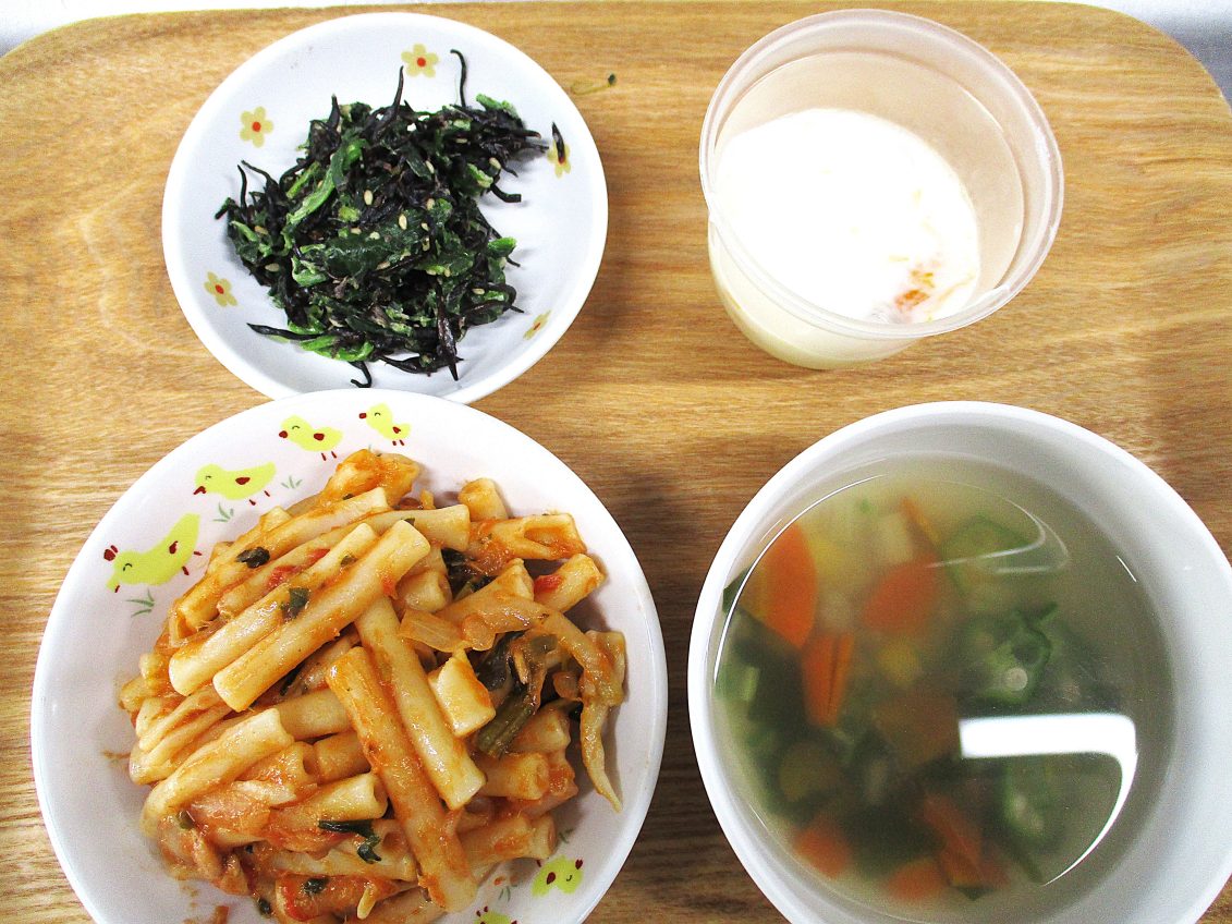 ・ツナトマトスパゲティ ・わかめスープ ・ひじきと法蓮草のサラダ ・フルーツヨーグルト