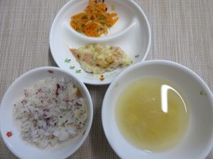 今日の給食は、さけのコーンマヨ焼きでした。今が旬のさけにコーンクリーム、マヨネーズ、粉チーズを混ぜたものをのせてオーブンでじっくり焼きました。焼くことで香ばしくなり、とてもおいしかったです。にんじんのシンプルサラダは酸味があり、さっぱりと食べることができました。ハリハリゆかりごはんは切干大根が入っていて、カルシムたっぷりごはんでした。しそふりかけが入っていることで食べやすくなり、ごはんが進みました。今日もピカピカになったお皿を見せながら、おいしかったと伝えてくれましたよ☺