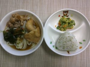 今日の給食は、お誕生日会でうどんトッピングバイキングでした。今日のうどんのトッピングは、肉炒め、あげ、ちくわの磯辺揚げ、わかめの4種類がありました。どのトッピングも全部乗せる子が多く、いろいろな味を楽しむことができました✨なかでも一番人気は、肉炒めでした。あげもおだしが染みていておいしかったです。ハリハリごはんのおにぎりもあり、子どもたちはおなかいっぱい食べることができました。いつもと違う給食で子どもたちが喜んでくれたので嬉しかったです☺