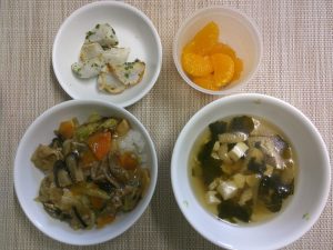 今日の給食は、中華丼でした。中華丼には、豚肉・はくさい・にんじん・たまねぎ・しいたけ・たけのこ・きくらげの7種類の食材が入っていて具沢山でおいしかったです。とろみもついていて食べやすく、ご飯と一緒にモリモリ食べていましたよ。ベイクド里芋は青のりの風味がして、ホクホクしていていました。豆腐のすまし汁は、油揚げのおだしも出て、飲みやすかったです。みかん缶は甘く、どのクラスも喜んで食べていましたよ☺