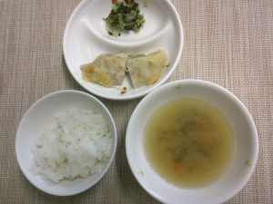 今日の給食は、さわらのサラダ焼きでした。さわらの上にマッシュポテトとクリームコーンがのっていてとてもおいしかったです。コーンの甘味があり、さわらが食べやすく、子どもたちも「おいしい~!」と言いながら食べていましたよ。ほうれん草のごま和えはあっさりと塩とごまのみの味付けでしたが、子どもたちの進みもよく、おかわりもしている子もいましたよ。
